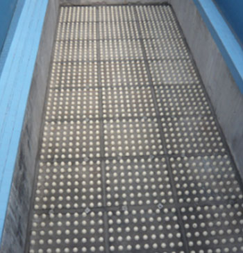 混凝土濾板是水處理工藝中關鍵裝置,在濾池中起到承載濾料層過濾和反沖洗配水(氣)的雙重作用。濾板的平整度和精度直接關系到水廠、污水廠的濾后水質、水量及運行的長期效益。傳統的濾池配水系統過濾和反沖洗時阻力大,配水不均勻、死水區多、濾料易板結、積泥,同時由于局部沖洗強度造成承托層松動,出現漏砂等不良后果。
